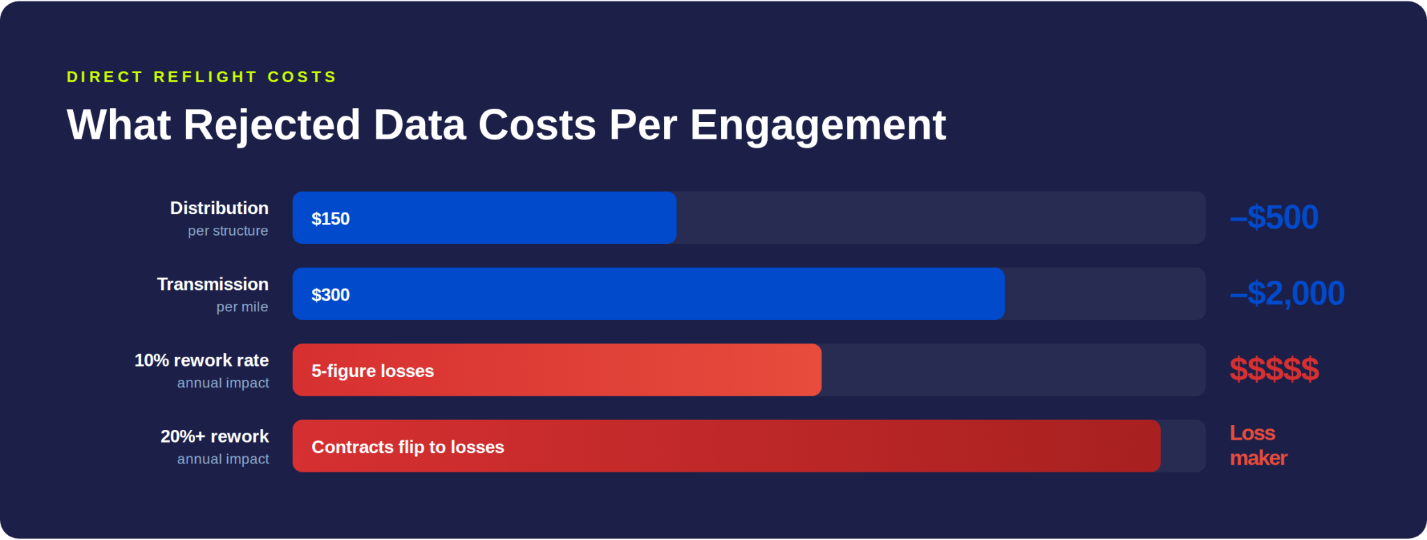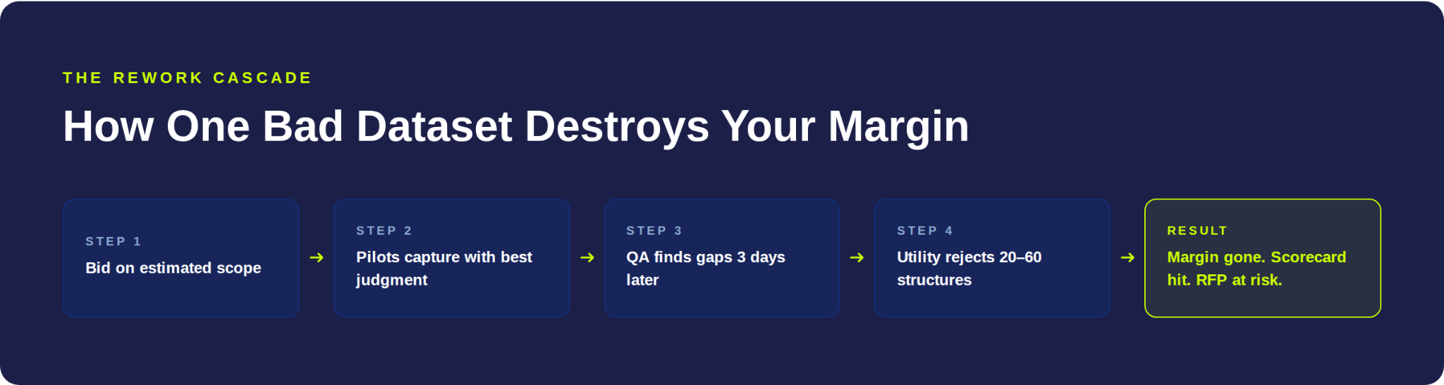 At typical utility inspection rates of $150–$500 per structure for distribution and $300–$2,000 per mile for transmission, even a 10% rework rate creates five-figure annual losses. At 20%+, it flips profitable contracts into loss-makers.