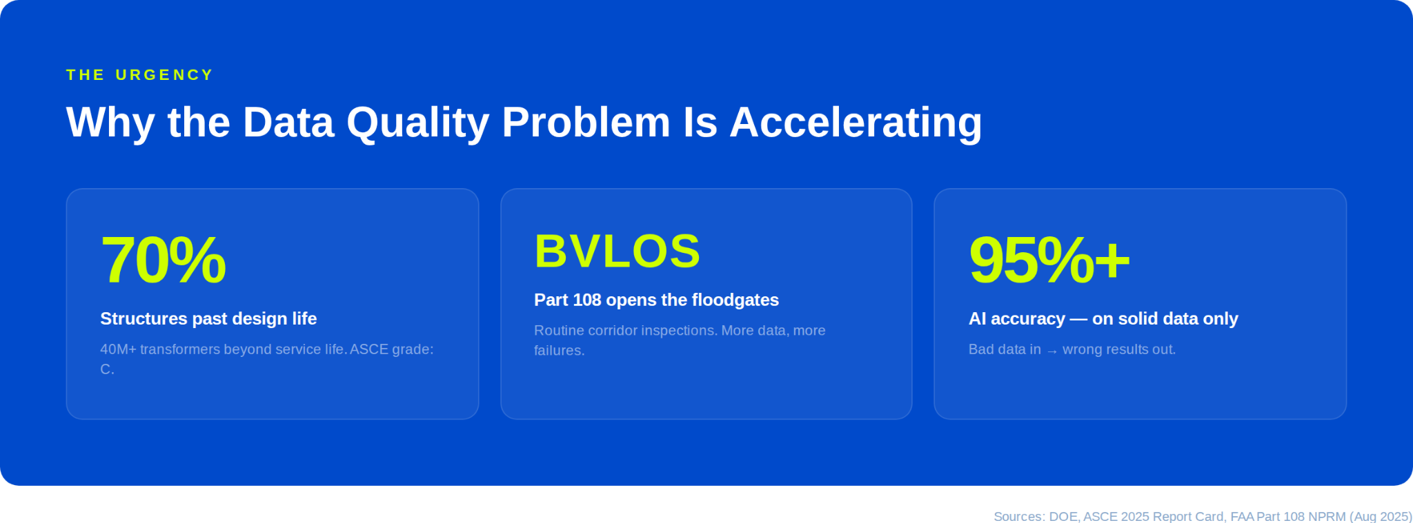 70% of transmission structures have exceeded their design life. Over 40 million distribution transformers are past intended service life. The ASCE’s 2025 Report Card rated U.S. infrastructure at a C. That means more inspections, not fewer.