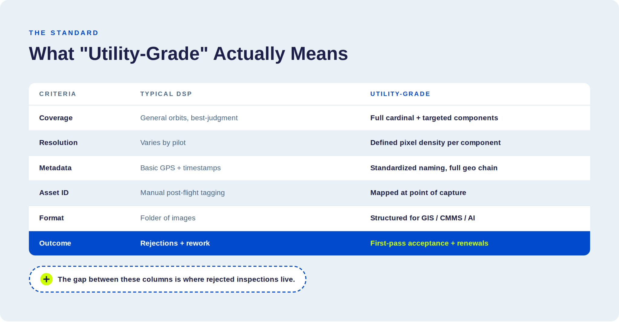 - You capture. Pilots make reasonable calls—but they’re not aligned with utility-specific requirements.