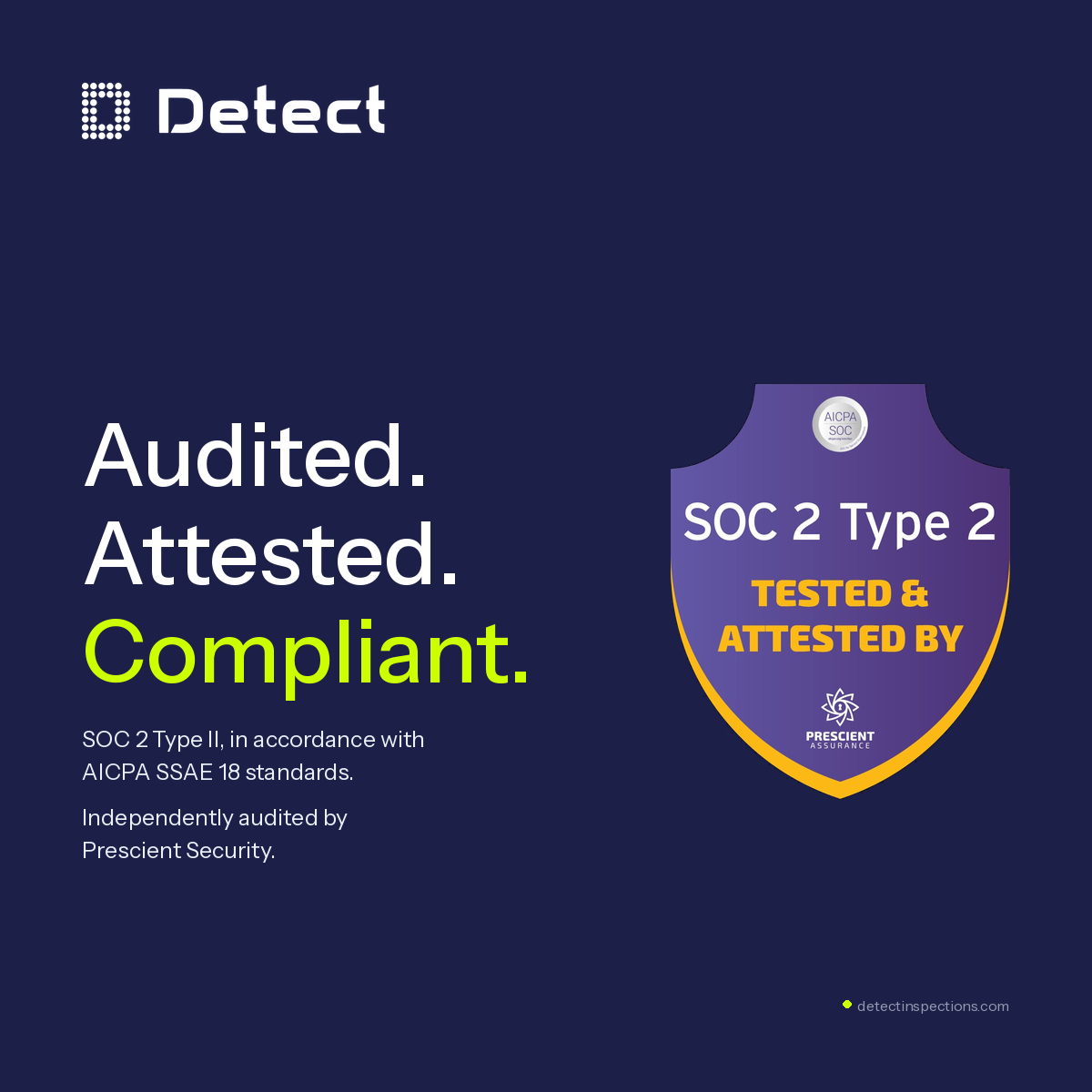 Detect has completed a SOC 2 Type II audit in accordance with American Institute of Certified Public Accountants (AICPA) standards for SOC for Service Organizations, also known as SSAE 18. The audit was performed by Prescient Security, an independent, AICPA-accredited CPA firm. The report is clean. No exceptions.