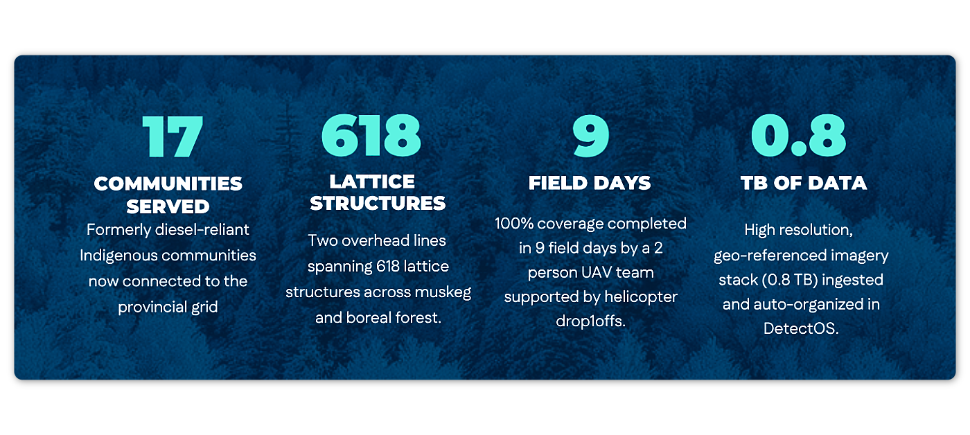The utility needed irrefutable documentation of construction defects across 618 lattice structures spanning two transmission lines (Lines A: 286 towers, Line B: 332 towers) through some of Canada's most challenging geography.